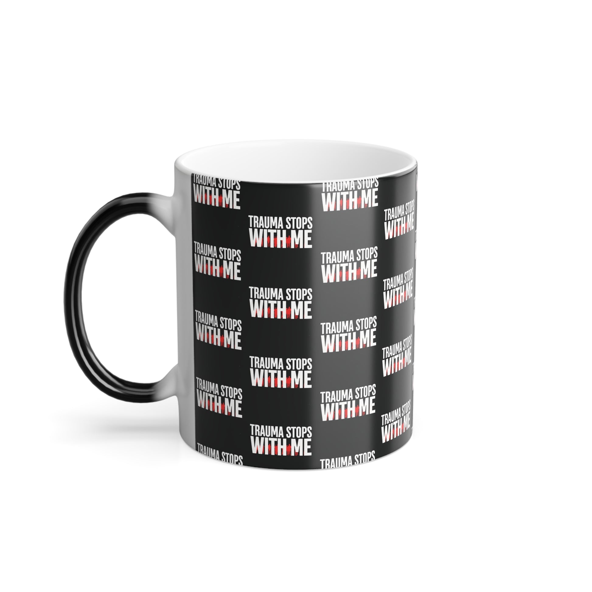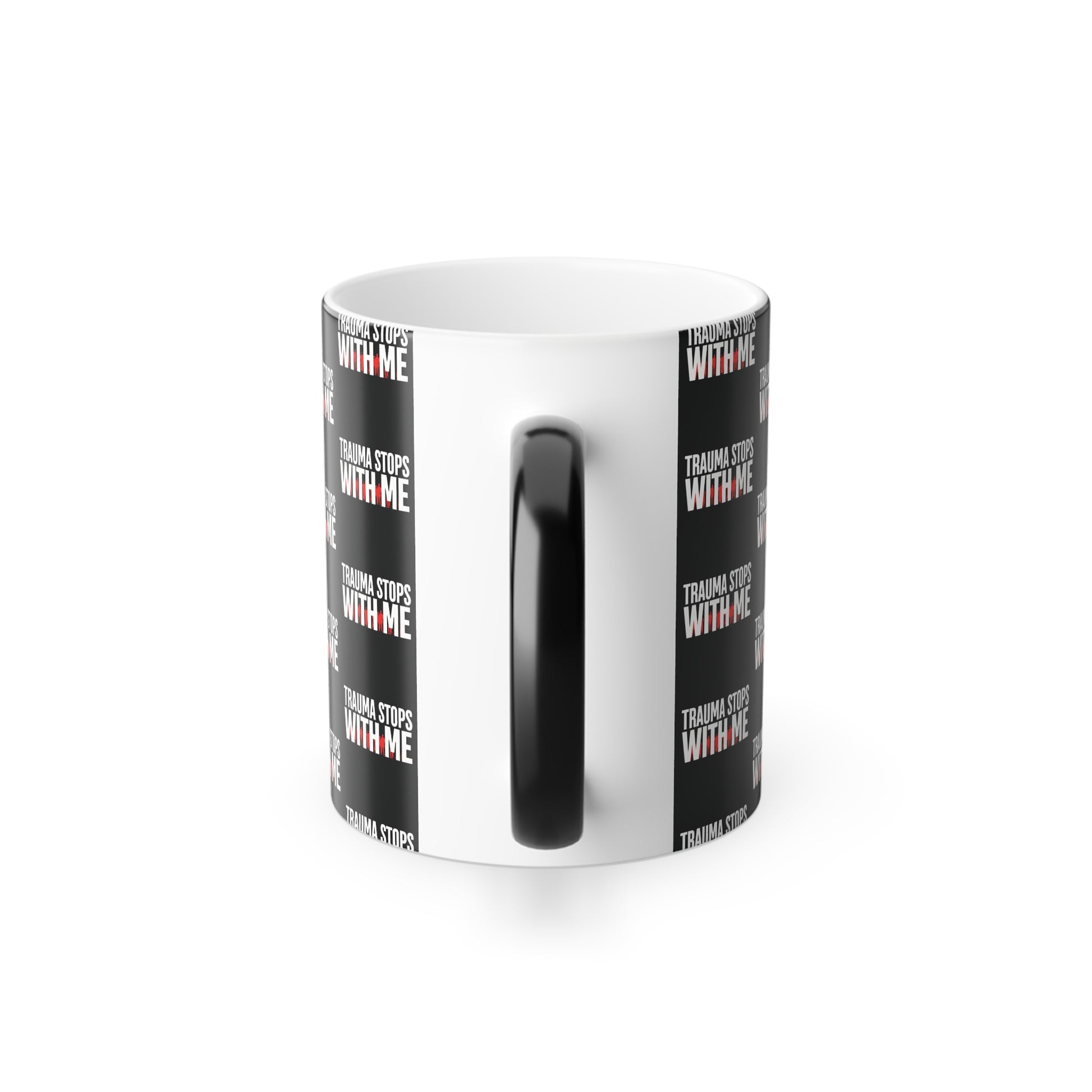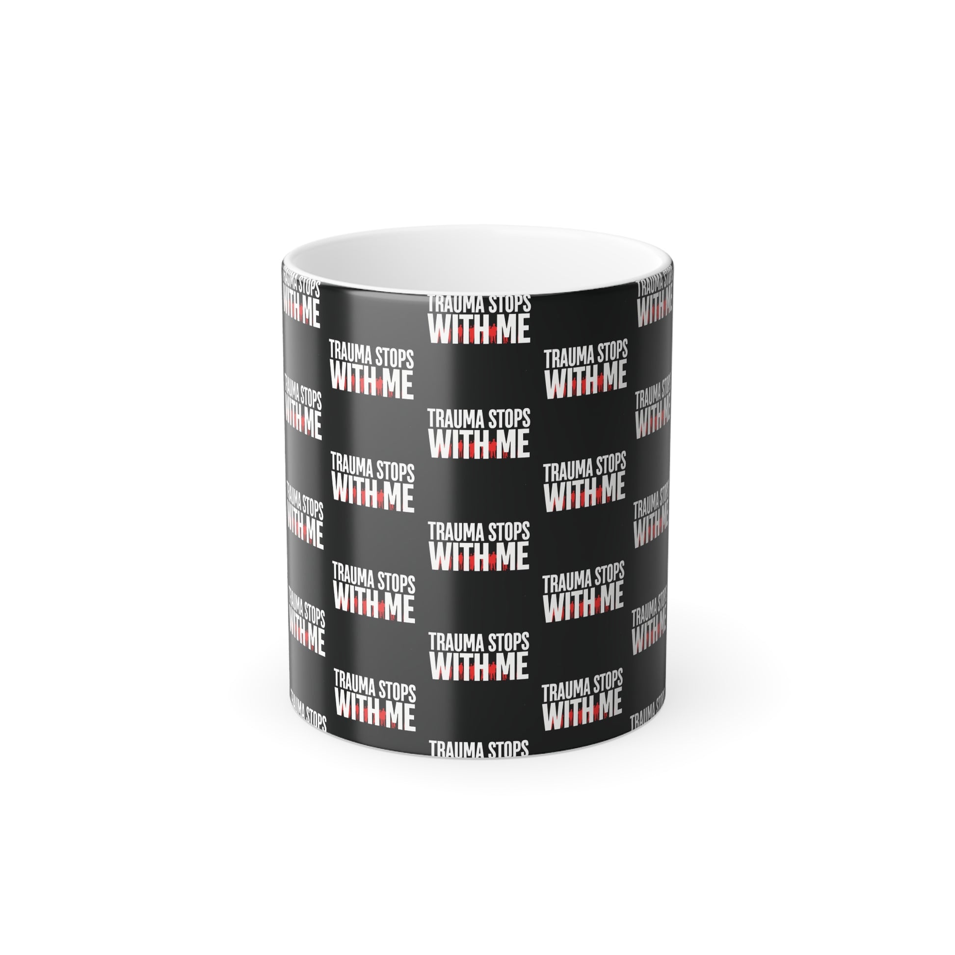 Brighten your day with this color-changing powerful mug, featuring the uplifting phrase “Trauma Stops With Me" in vibrant black with red and white color print and graphics.