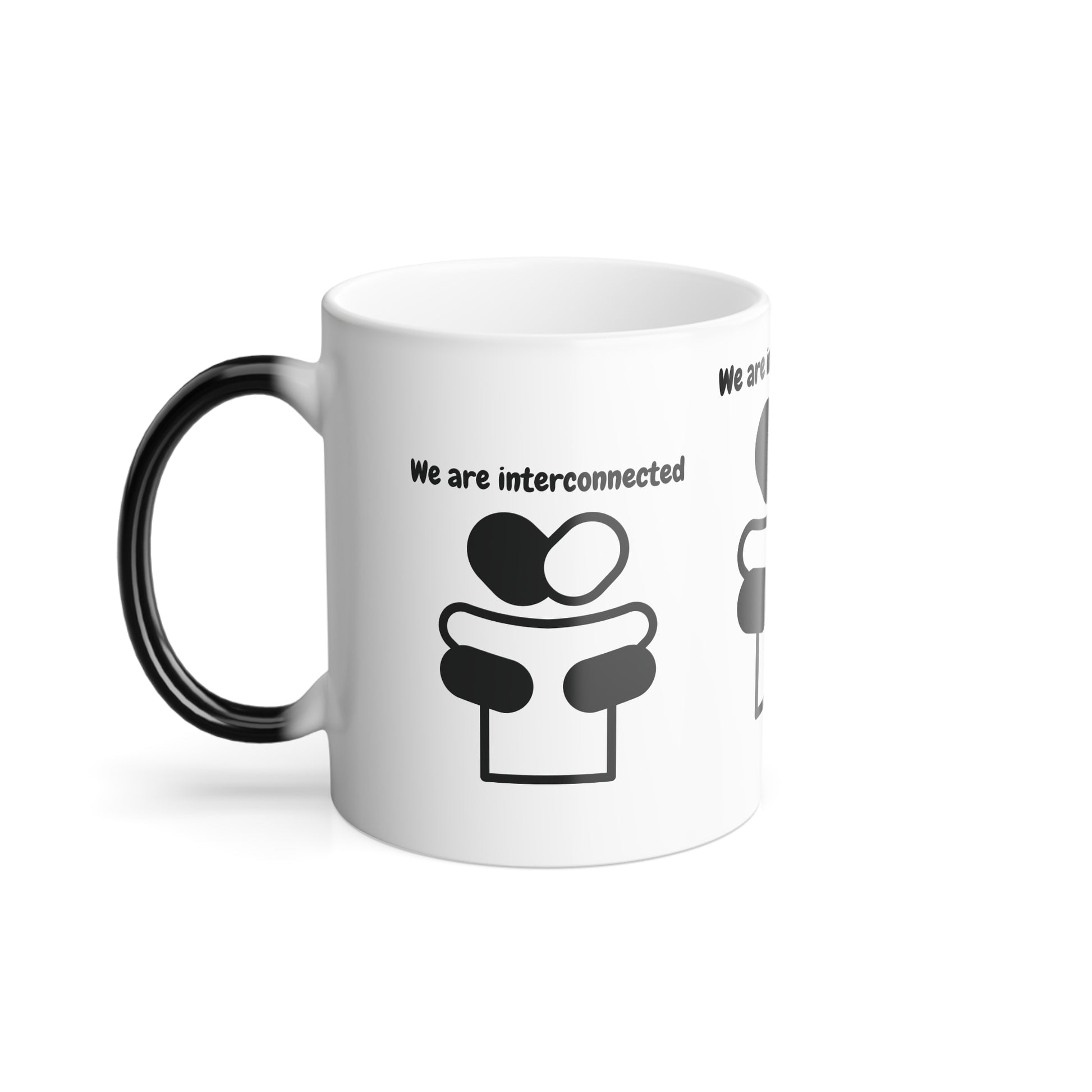 Brighten your mornings with this color-changing affirmation mug, featuring "We Are Interconnected" in vibrant white with black print and graphics. When filled with a hot drink, the heat-reactive surface reveals the message, then returns to its sleek black finish as it cools—creating a magical moment with every sip.