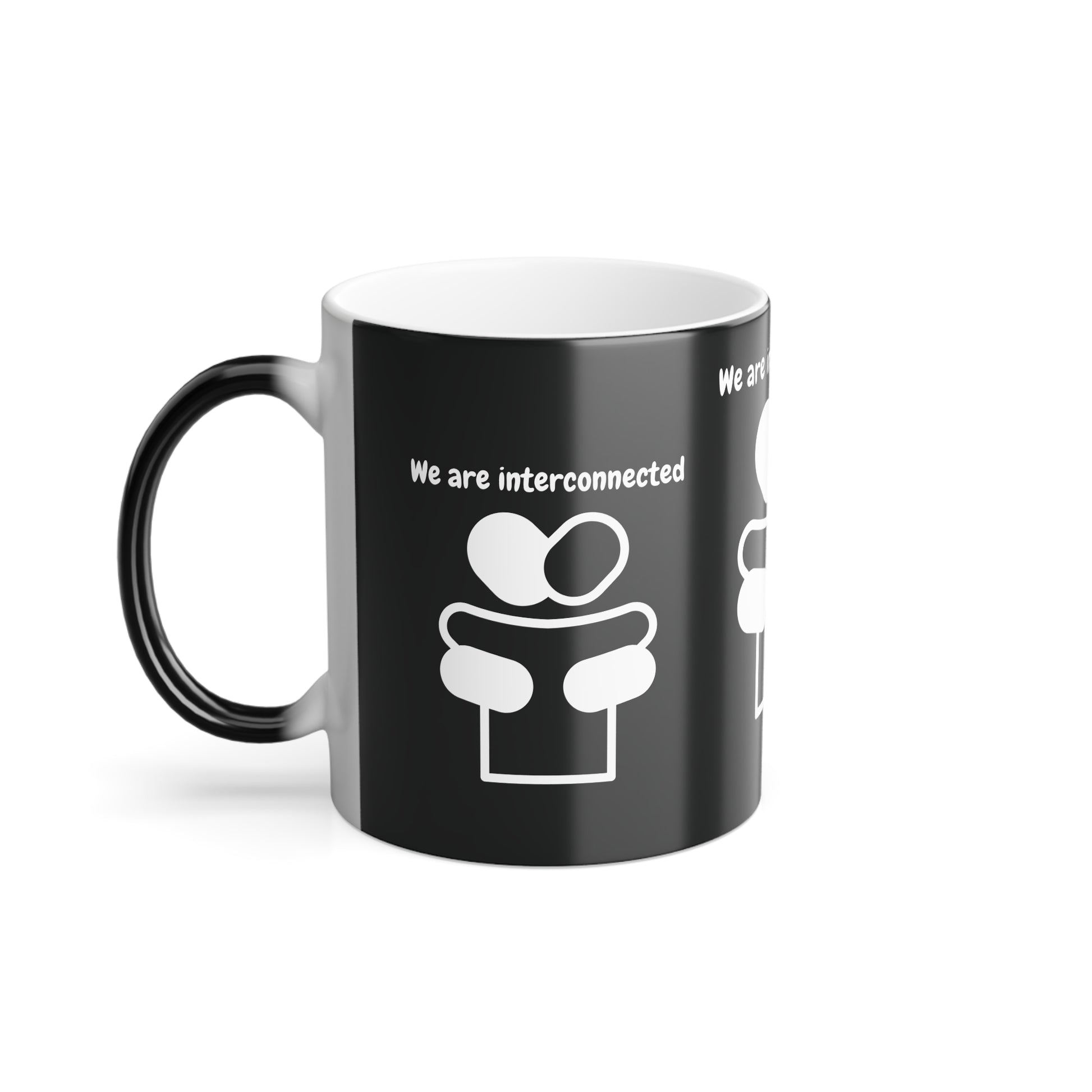 Brighten your mornings with this color-changing affirmation mug, featuring "We Are Interconnected" in vibrant black with white print and graphics. When filled with a hot drink, the heat-reactive surface reveals the message, then returns to its sleek black finish as it cools—creating a magical moment with every sip.