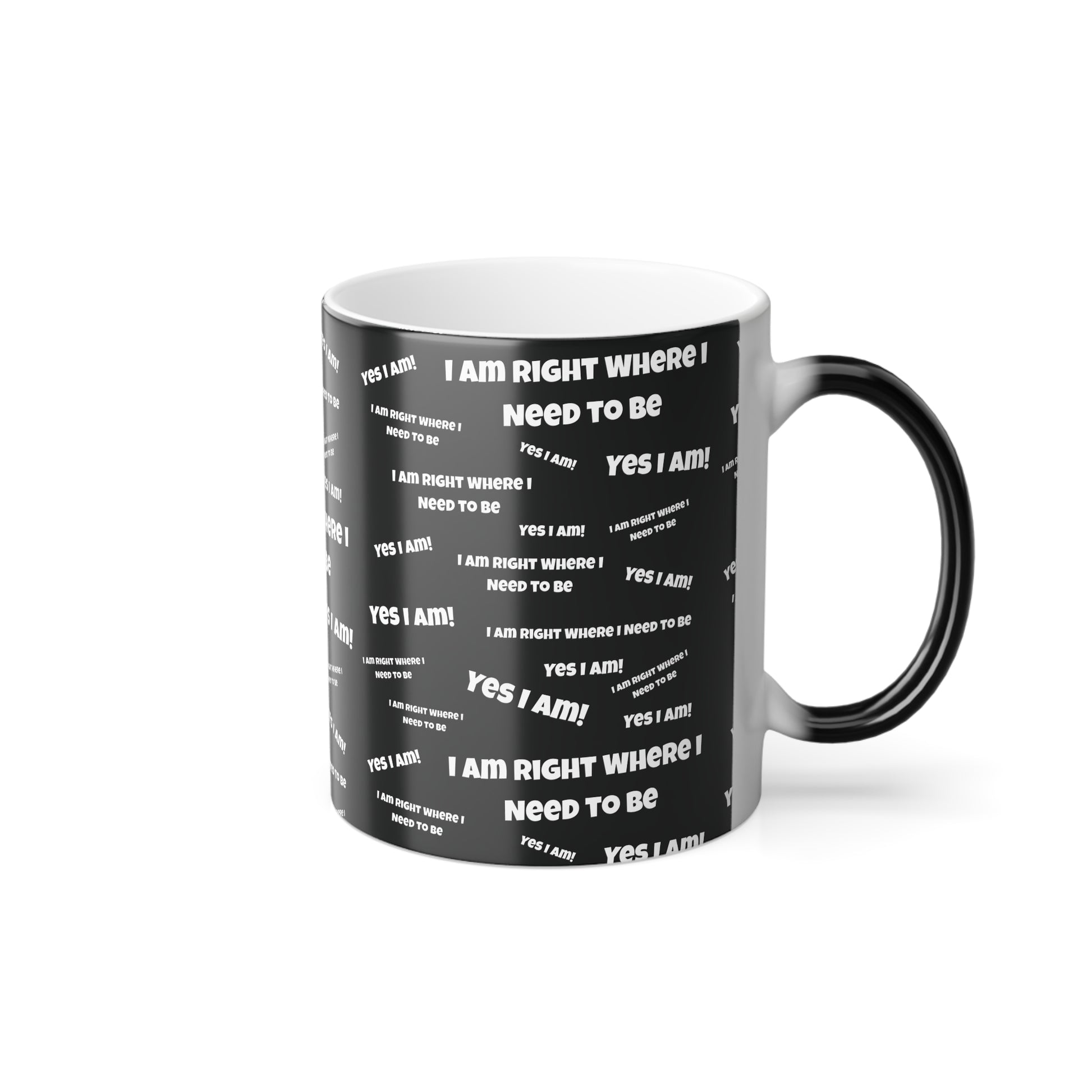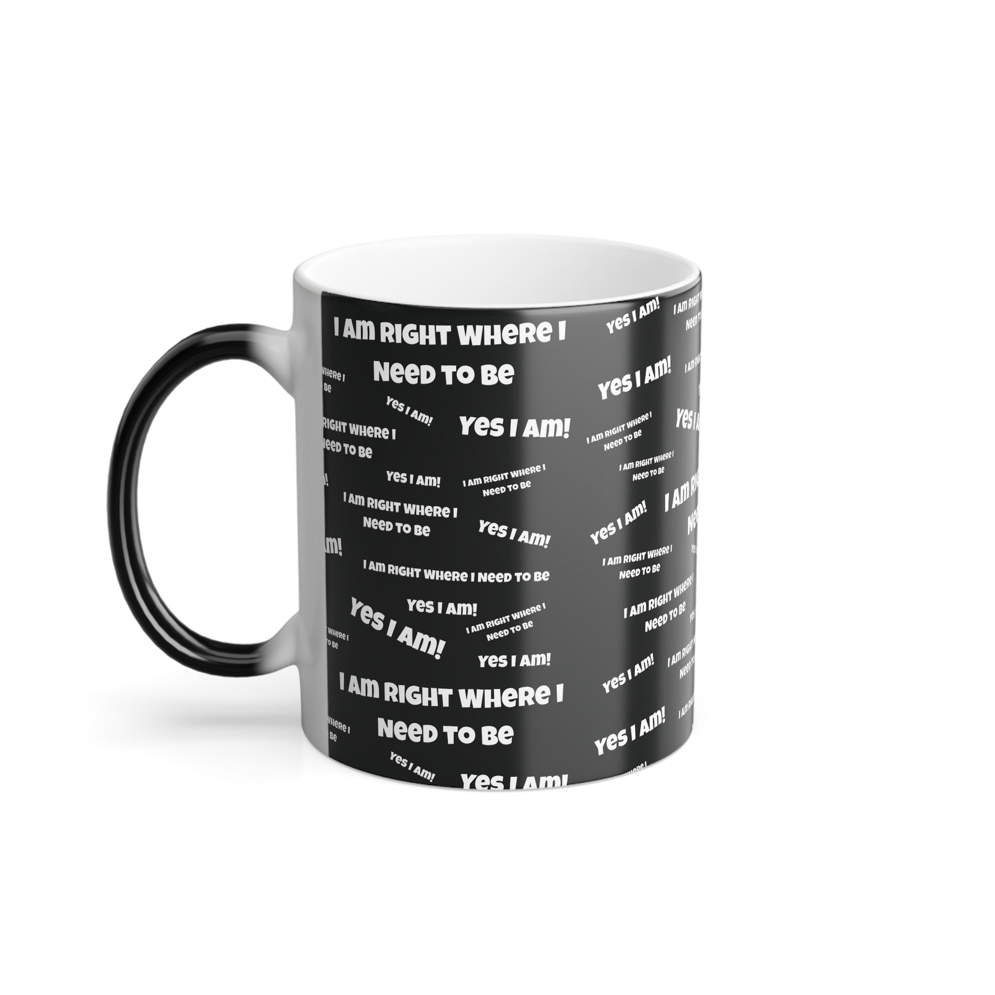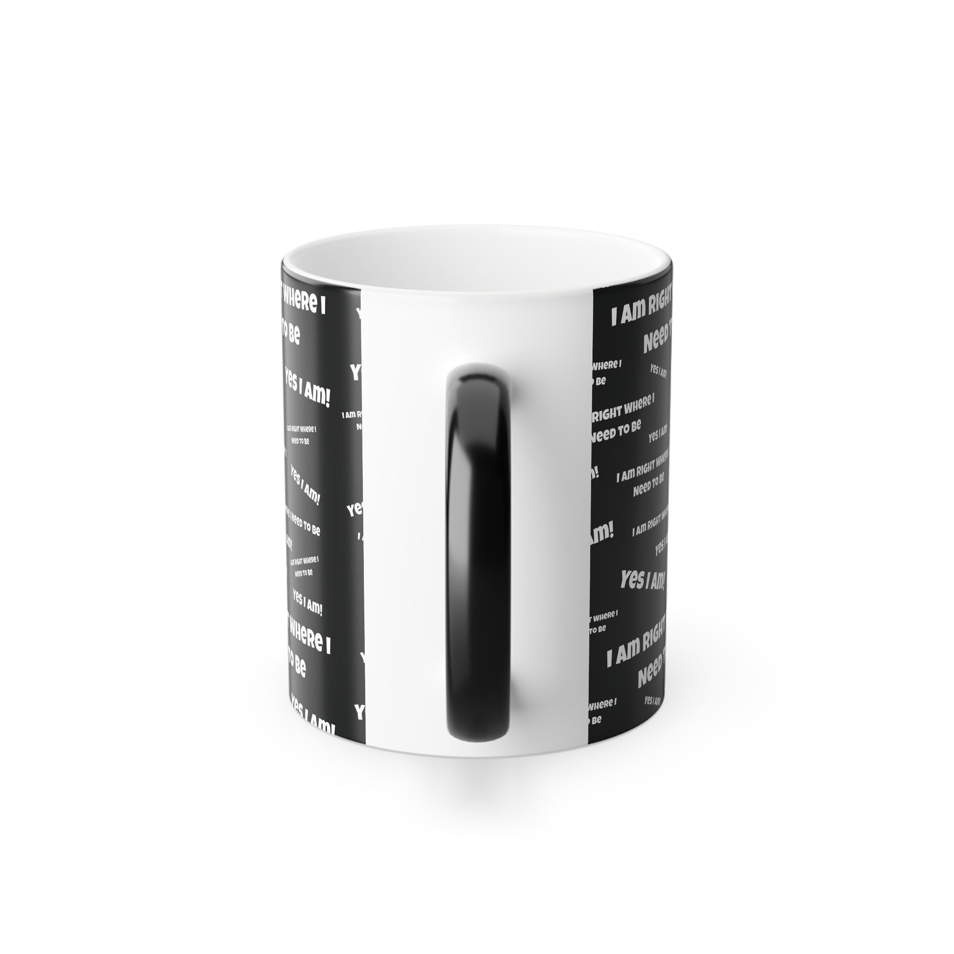 Brighten your day with this color-changing powerful mug, featuring the uplifting phrase “I Am Right Where I Need to Be" in vibrant black with white print and graphics.